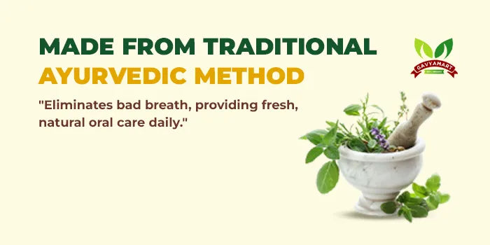 Gavyamart Gomay Dantmanjan is a natural, herbal tooth powder made from cow dung ash and other Ayurvedic ingredients. It promotes oral hygiene, strengthens gums, and helps maintain fresh breath without harmful chemicals.