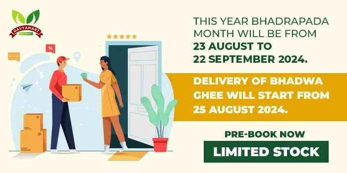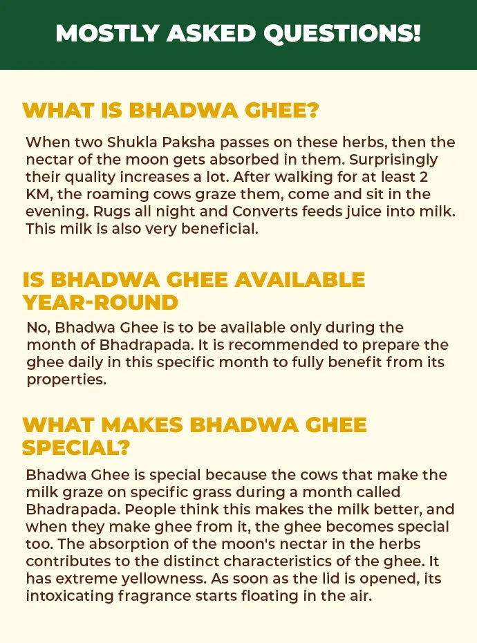 Bhadwa Ghee: The Essence of Seasonal Wellness Limited Availability: Experience the Tradition of Bhadwa Ghee Bhadwa Ghee, a revered traditional Indian ghee, is known for its unique preparation methods and rich flavor. Made from the milk of indigenous cows, this ghee embodies the essence of purity and health, offering a delightful addition to your culinary repertoire. The Rich Tradition of Bhadwa Ghee Bhadwa Ghee is celebrated for its unique qualities, derived from the seasonal grasses during the Bhadrapada month. Cows graze on nutrient-rich herbs like Dhaman and Sevna, producing exceptionally rich milk. Crafted through traditional churning of curd and gentle heating of butter, this vibrant and aromatic ghee enhances any dish. Embrace Bhadwa Ghee for its delightful flavor and nutritional benefits! Distinctive Characteristics: Captivating Aroma: Each jar of Bhadwa Ghee releases an enchanting fragrance that elevates any dish, making it a must-have in your kitchen. Brilliant Yellow Hue: The bright color not only signifies purity but also reflects the nutrient density of the ghee, rich in beneficial compounds.