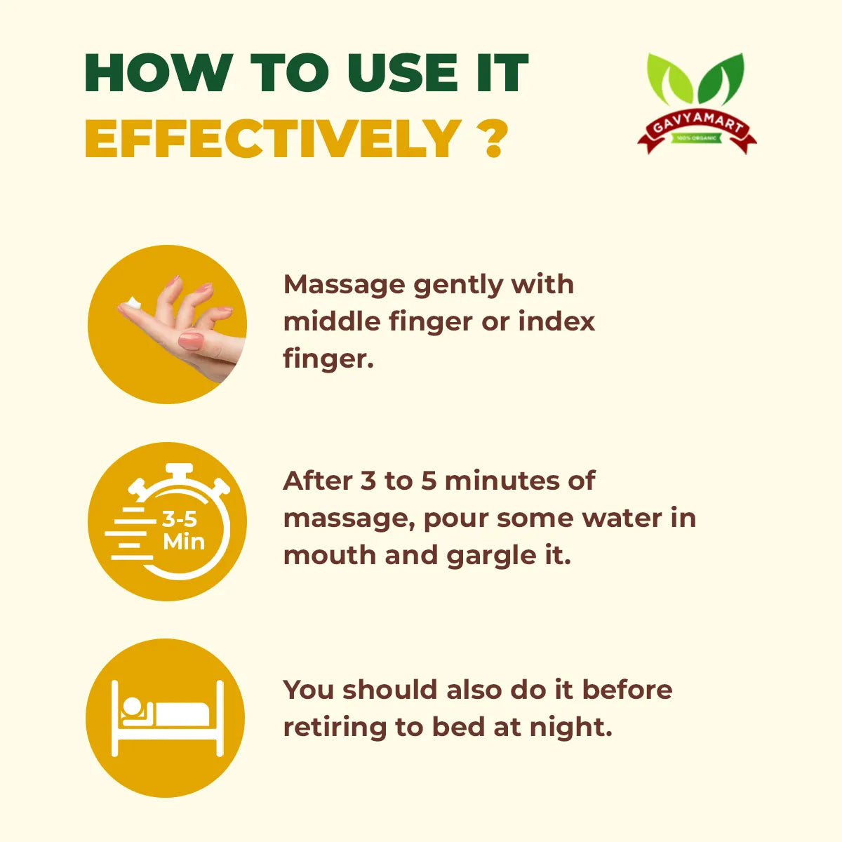 Massage a small amount gently onto your gums and teeth with your finger.