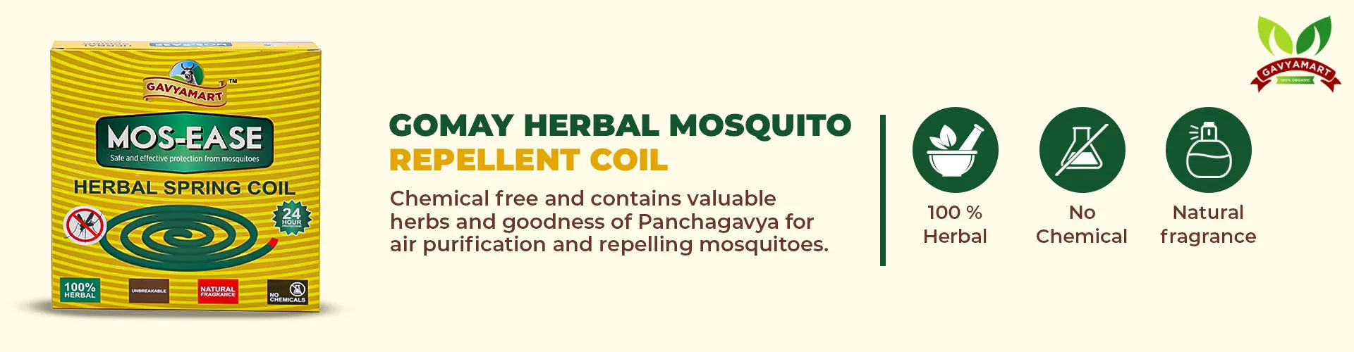 Gomay Herbal Mosquito Repellent Coils are made from natural ingredients, including cow dung and essential oils, providing a chemical-free way to repel mosquitoes. They are effective for long-lasting protection while being eco-friendly and safe for indoor use.